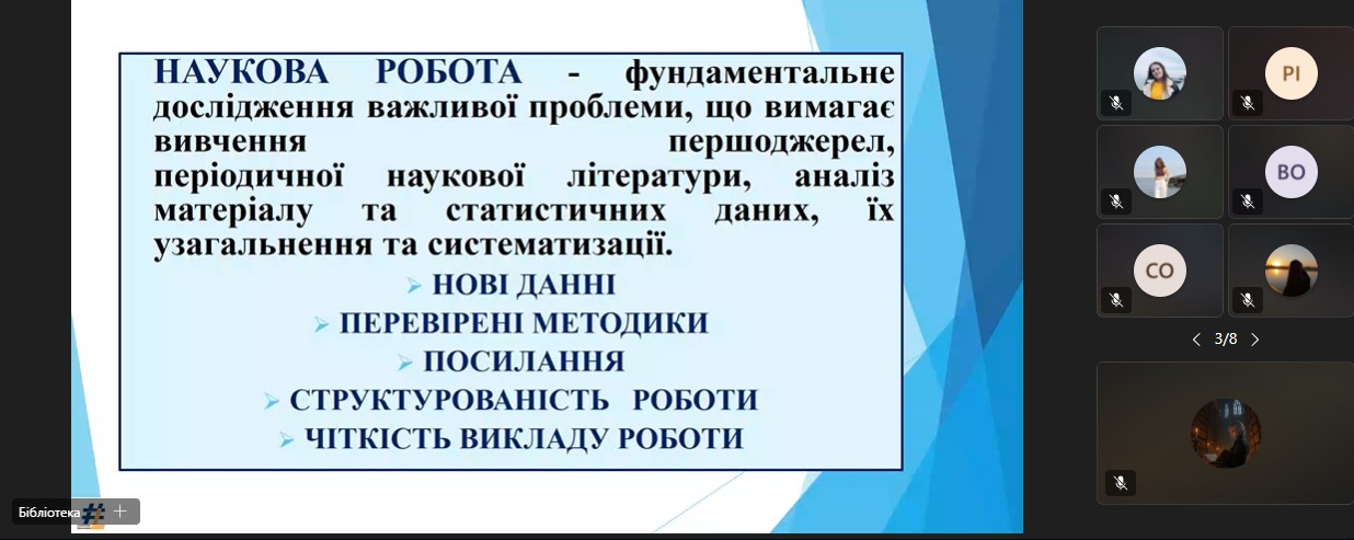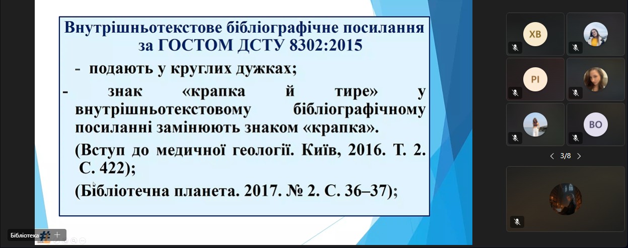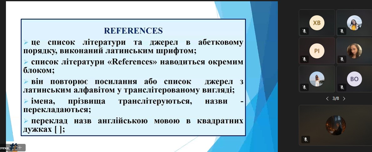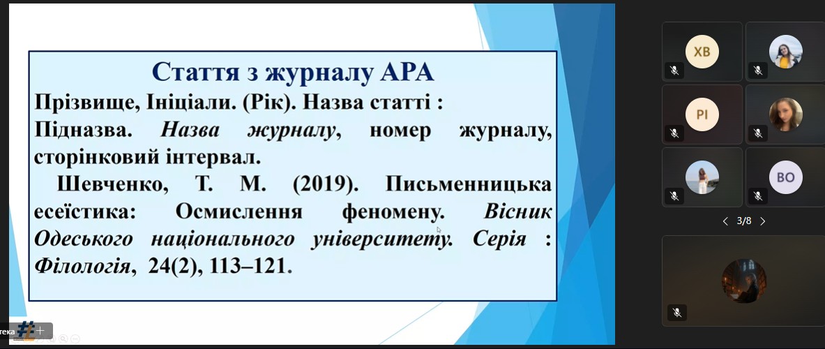 11.11.2025 з нагоди Всесвітнього дня науки в ім’я миру та розвитку бібліотека Університету Ушинського організувала та провела онлайн-лекцію, присвячену актуальним питанням оформлення списку використаних джерел у наукових роботах з теми : «Оформлення списку використаних джерел у науковій роботі за ДСТУ 8302:2015 та стилем АРА».