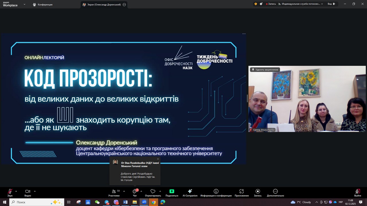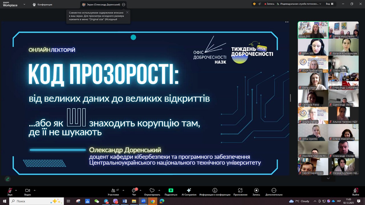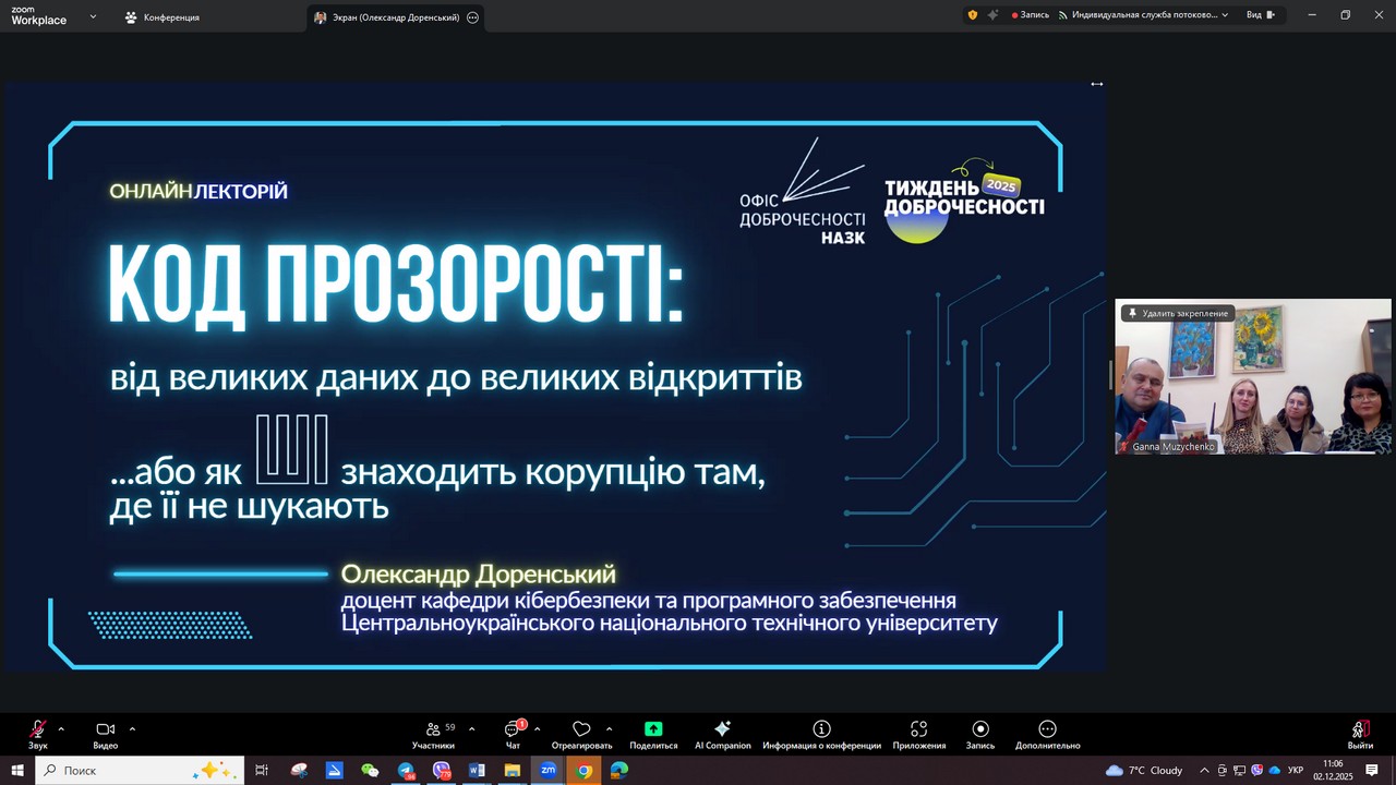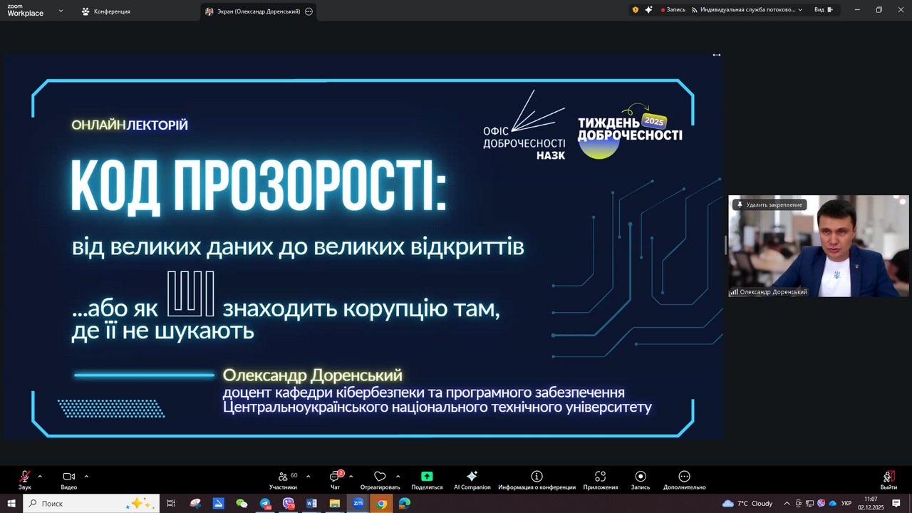 лекція «Код прозорості: від великих даних до великих відкриттів або як ШІ знаходить корупцію там, де її не шукають», спікер – Олександр Доренський, кандидат технічних наук, доцент кафедри кібербезпеки та програмного забезпечення Центральноукраїнського національного технічного університету.
